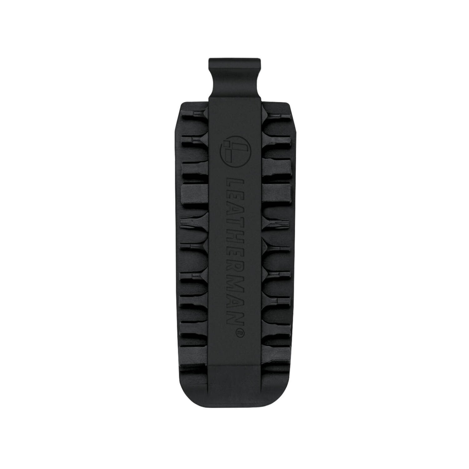 Translation missing: en.Black Leatherman bit kit holder with multiple interchangeable screwdriver bits arranged on both sides, featuring the Leatherman logo embossed in the center